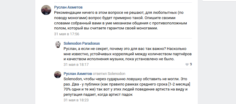 Из требований мне больше всего понравился этот пункт - "моногамность. Принципиально. Проверю одним вопросом". То есть для работы музыкантом в переходе ты должен всю жизнь жить с одним и тем же сексуальным партнером (неважно какого пола, кстати). И как этот прекрасный человек проверяет моногамность одним вопросом - мне страшно интересно узнать?!!