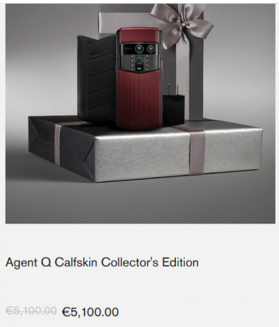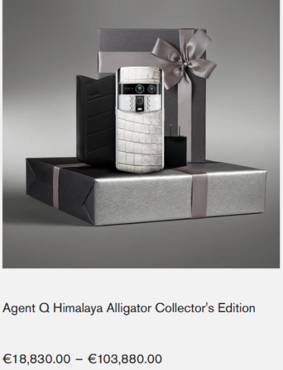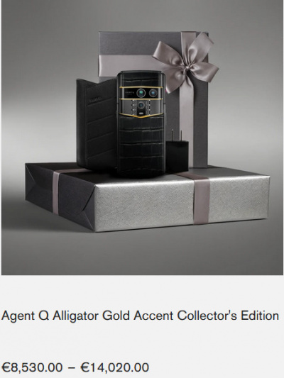Agent Q "обтянут безупречной кожей из члена крокодила, украшен отсеком для SIM-карт в форме соколиного крыла и доведён до совершенства благодаря швейцарскому шарниру, 320 собранным вручную компонентам, U-образной бесшовной формовке, толстому золотому покрытию и керамической подушке". Также производитель сообщает, что «это не дизайн», «это церемония».