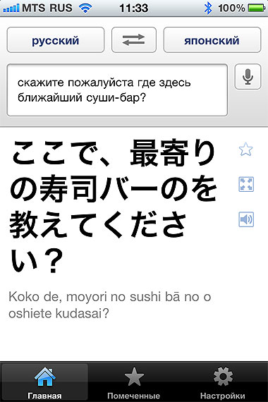 Ну и все. Произнесли фразу вслух, нажали на кнопочку - айфон японцу зачитал вслух вопрос. Японец ответил - программа распознала и перевела вам на русский.