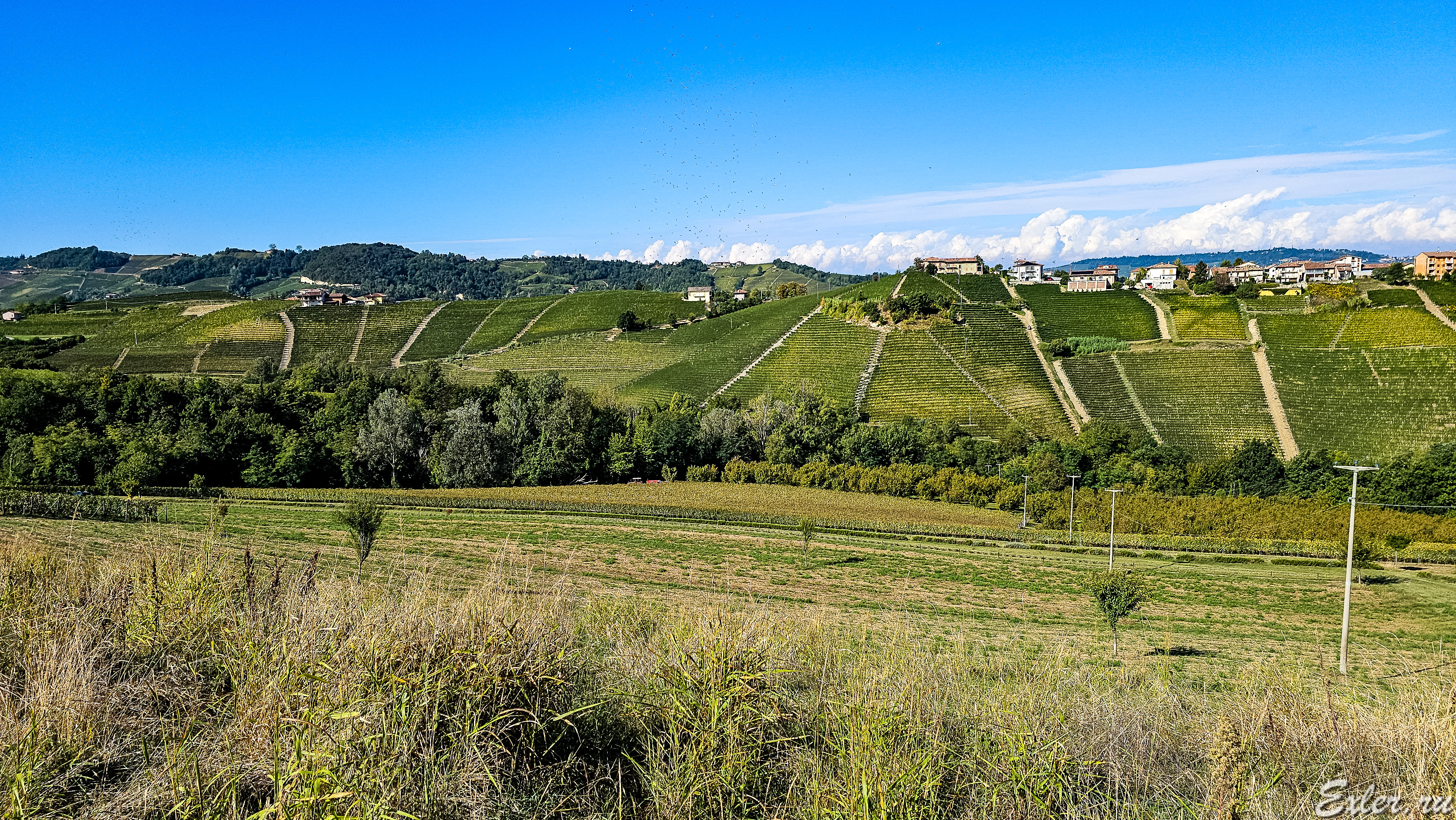 По холму спустились вниз в небольшой лесок. Там очень красиво, вокруг - сплошные виноградники с сортами неббиоло и барбареско. Собственно, в этих краях выращивают только две культуры (наиболее ценные) - это виноград и орехи фундук (пьемонский фундук - отличный, очень вкусный).