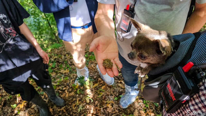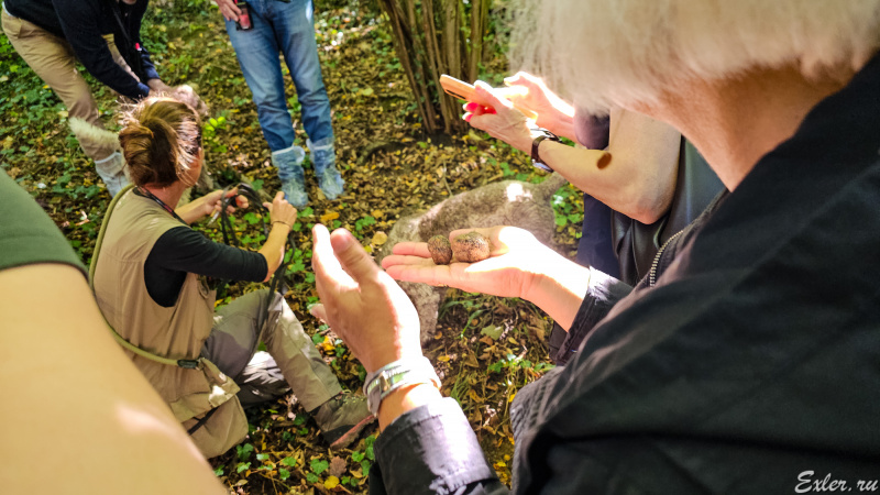 Мы прошли буквально пять минут, и вот уже собачка обнаружила трюфель и стала разрывать землю вокруг него. После этого собачку отводят в сторону, и охотница сама начинает очень осторожно выкапывать трюфель: если его повредить, то он утратит всю свою ценность, потому что быстро испортится.