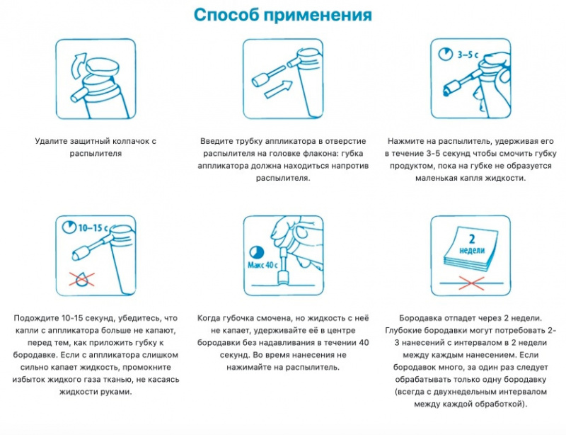 Комплект выглядит следующим образом: аэрозоль, 12 аппликаторов, инструкция к применению.