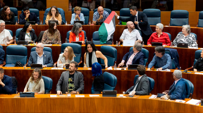 И он попросил депутата от Más Madrid убрать с места флаг Палестины. Место, где он был размещен, принадлежало Химене Гонсалес, отсутствовавшей на пленарном заседании в четверг, потому что она собиралась отправиться к флотилии Газы. «Вы уже долгое время имеете этот флажок. Снимите этот флажок. Снимите его!». Депутаты Más Madrid сделали вид, что не слышат. И вызвали председателя, чтобы он вызвал службу палаты для его удаления, но без успеха.