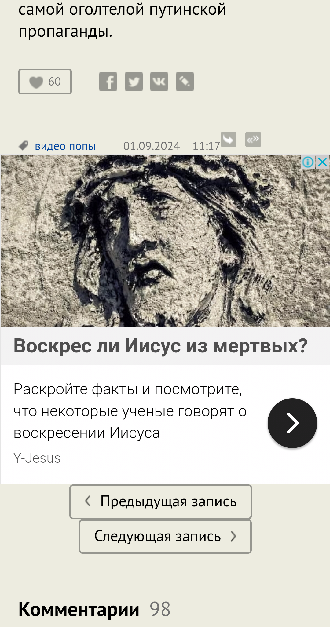 Попика зовут Валерий Сосковец, он вещает в какой-то церкви в Московской области. Христианин, говорит попик, рождается для войны - прям со своего крещения уже, можно сказать, готов. В войне не должно быть переговоров и мирных соглашений, все переговоры и компромиссы - от лукавого. Так что главный долг любого христианина, как говорит попик, сдохнуть за Христа.