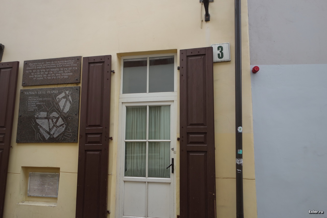 Памятная табличка на улице Гаоно 3 показывает границы печально известного Вильнюсского гетто, в котором во время войны погибло более 40 тысяч евреев. Вертикальная планка справа от цифры 3 отмечает ворота гетто, через которые были отправлены на смерть более 11 тысяч человек.