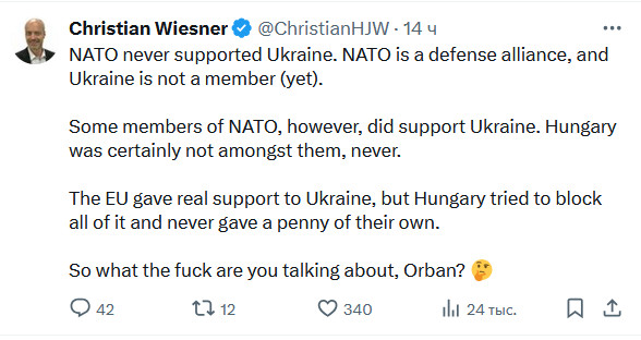 НАТО никогда не поддерживало Украину. НАТО – это оборонный альянс, а Украина (пока) не является его членом. Однако некоторые члены НАТО действительно поддерживали Украину. Венгрия, безусловно, не была среди них, никогда. ЕС оказал Украине реальную поддержку, но Венгрия пыталась заблокировать все это и никогда не дала ни копейки из своих средств. Так о чем ты, черт возьми, говоришь, Орбан?