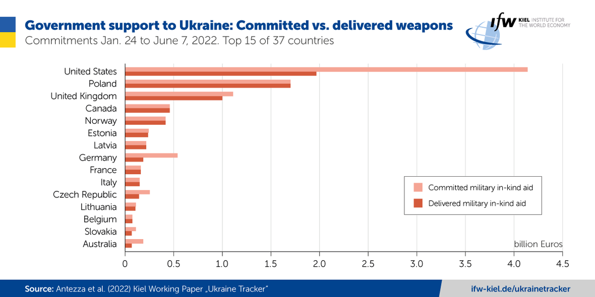 Во-первых, Германия на 4 месте по совокупной обещанной помощи (Total bilateral aid commitments to Ukraine). Причем на четвертое место Германия поднялась только в последнем отчете (на 7 июня), а до этого была на пятом (по ссылке можно найти прошлые отчеты).