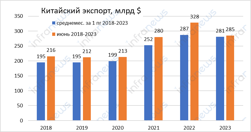 В июне китайский экспорт в долларовом выражении составил 285,32 млрд долларов США – это примерно на 12,5% меньше, чем годом ранее. Как отметили большинство международных СМИ, это падение стало самым сильным за период с февраля 2020 года, т.е. с начала пандемии.