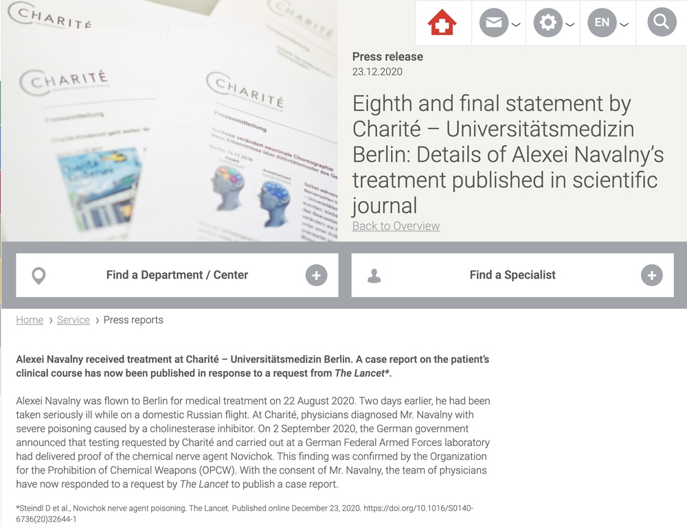 «Начало и продолжительность терапии атропином в течение первых двух дней остаются неясными. К счастью, несмотря на высокий риск аспирации в начальный период потери сознания и колонизацию несколькими бактериями с множественной лекарственной устойчивостью, у пациента не развилось серьезной инфекции. Его хорошее состояние здоровья до отравления, вероятно, способствовало его выздоровлению», — говорится в отчете Charite.