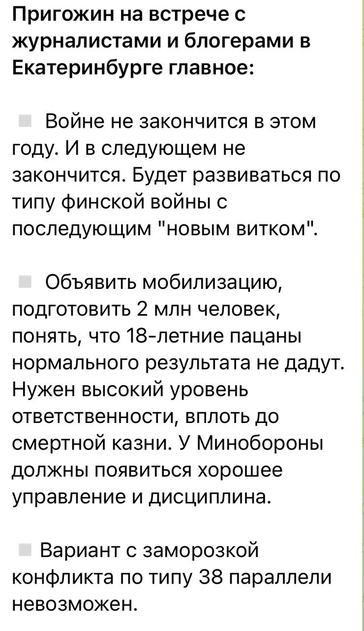 "Пригожин требует мобилизовать 2 миллиона россиян на войну в Украине. Ранее РФ в 2022-23 годах мобилизовала в рамках частичной мобилизации 300 тысяч в РФ, не менее 70 тысяч зэков, до 150 тысяч на оккупированных территориях, до 200 тысяч заключили контракт. Однако из-за огромных потерь и низкой боеспособности людей для наземной войны все равно не хватает. Пригожин требует мобилизовать 2 миллиона россиян - в 7 раз больше, чем мобилизовали в РФ ранее. Очевидно, Пригожин готовит россиян к полномасштабной мобилизации большинства дееспособного мужского населения, и требует этого от Путина."
