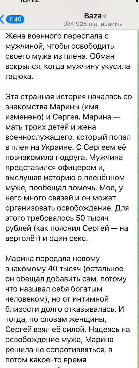 Итак, "Надеясь на освобождение мужа, Марина решила не сопротивляться, а потом какое-то время продолжала общение с новым знакомым, но тут случилось редкое несчастье — Сергея укусила гадюка.