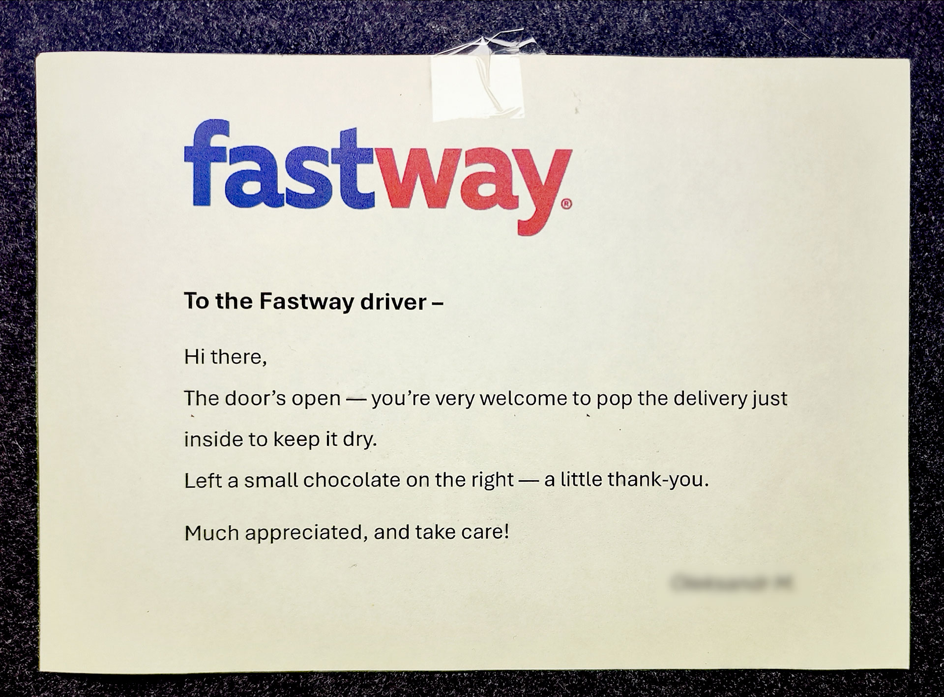 У меня больше всего проблем возникает с fastway. Они промахиваются с доставкой (моя посылка оказывается у соседей) и не следуют инструкциям в описании к заказу. Поэтому придумал такую записку. Идея, чтобы курьер из далека увидел, когда очередной раз решит мою посылку под соседскую дверь положить.