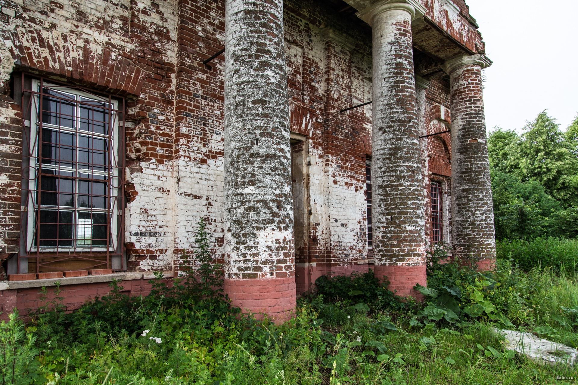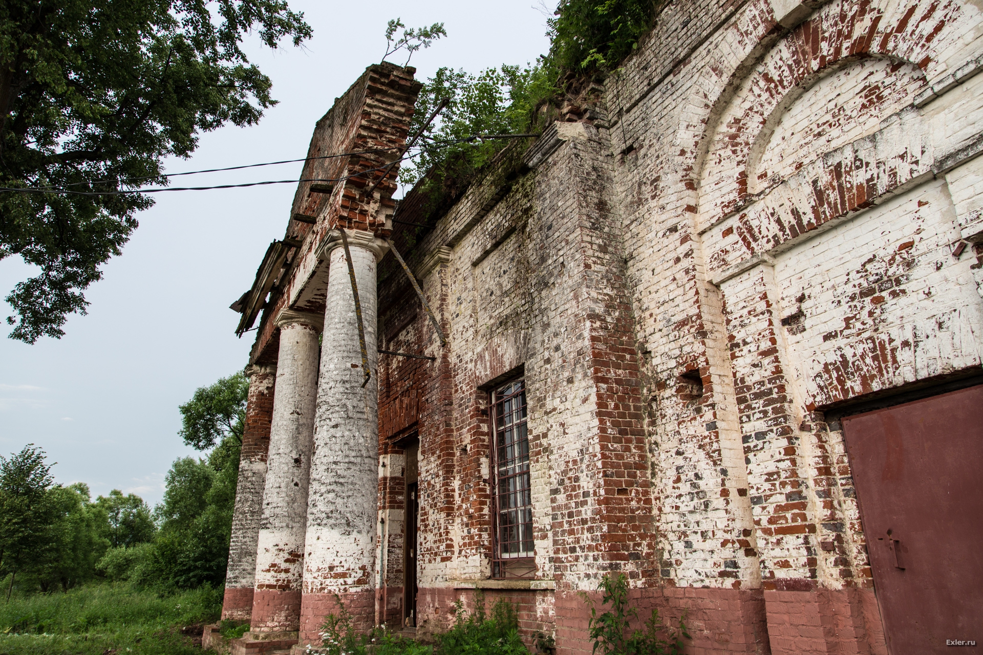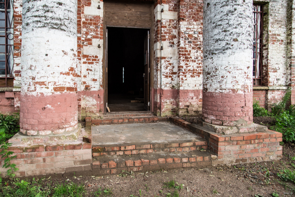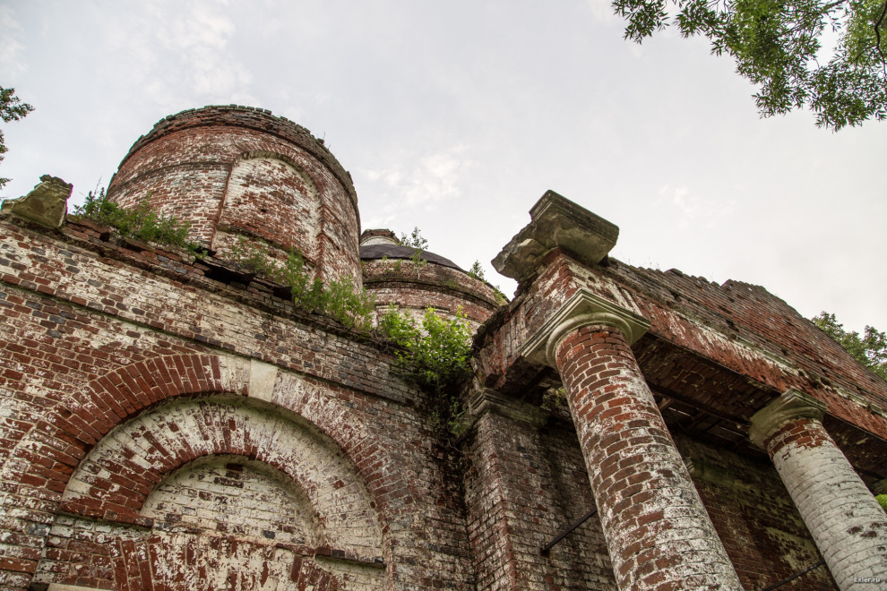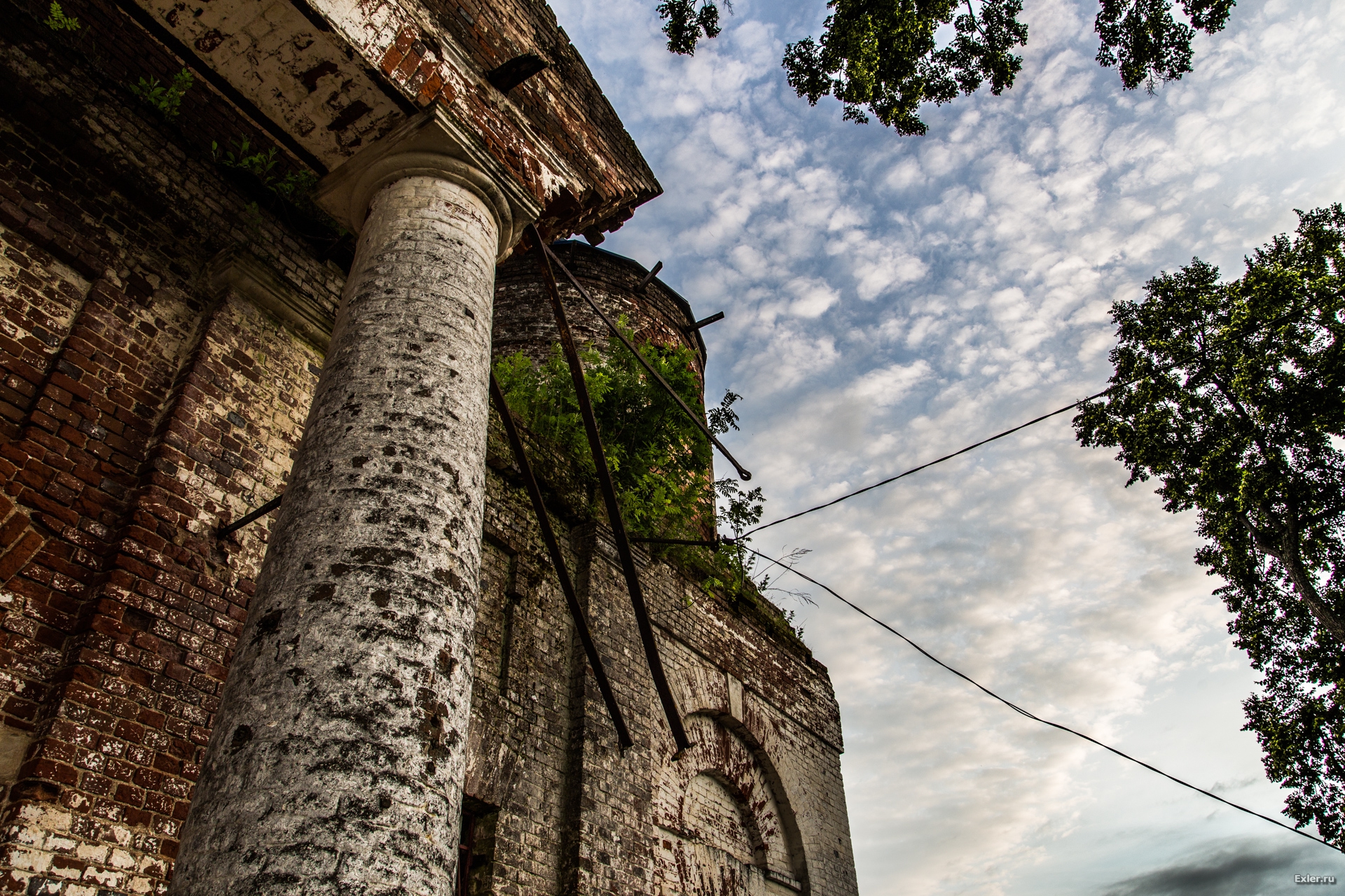 Осталась еще невосстановленной одна колонна. Некие уроды, которые таким образом пытались кирпич добыть, обвязали ее тросом и рванули трактором. Никаких кирпичей, разумеется, они добыть не сумели, а колонну изуродовали. Жаль, что она не им на пустые бошки упала.