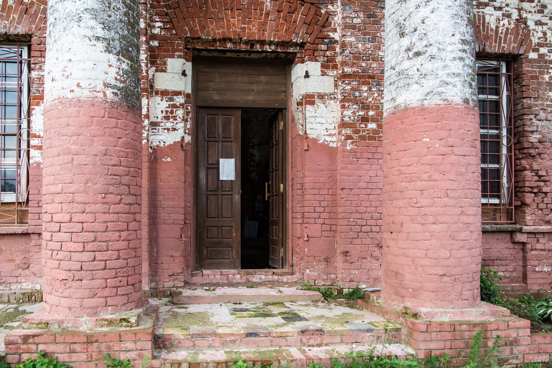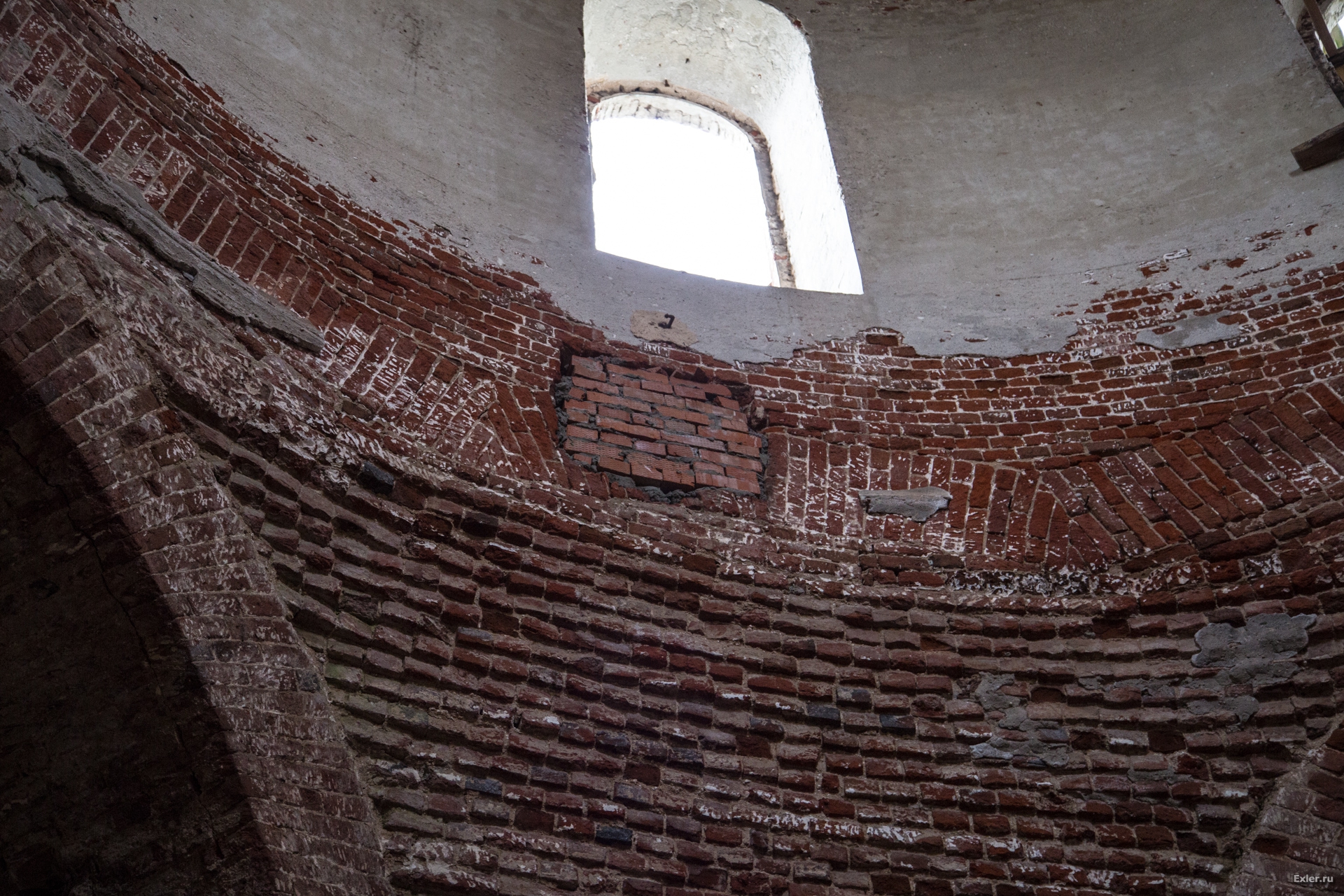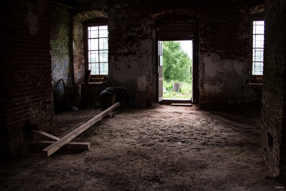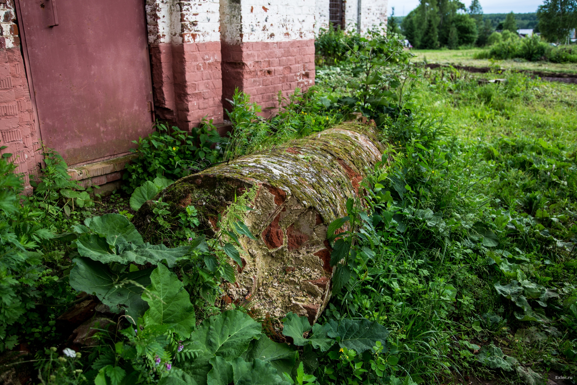 Осталась еще невосстановленной одна колонна. Некие уроды, которые таким образом пытались кирпич добыть, обвязали ее тросом и рванули трактором. Никаких кирпичей, разумеется, они добыть не сумели, а колонну изуродовали. Жаль, что она не им на пустые бошки упала.