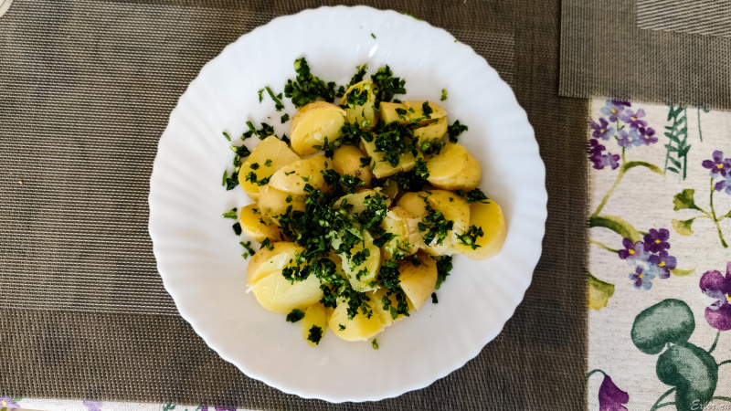 Вопрос у меня. Вот смотрите. Берёте картошечку молоденькую, да такую молоденькую, что колупнешь ей кожурку ноготочком, кожурка-то и отходит. Аккуратненько варите картошечку, чтобы она не разварилась. Потом ее немножко режете ножичком, поливаете ее маслицем топлененьким. А потом еще туда меленько порезанного чесночка, да с укропчиком и петрушечкой.