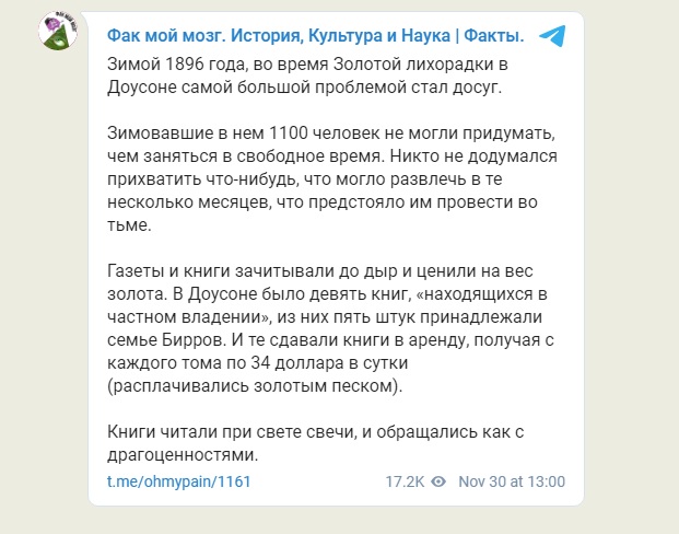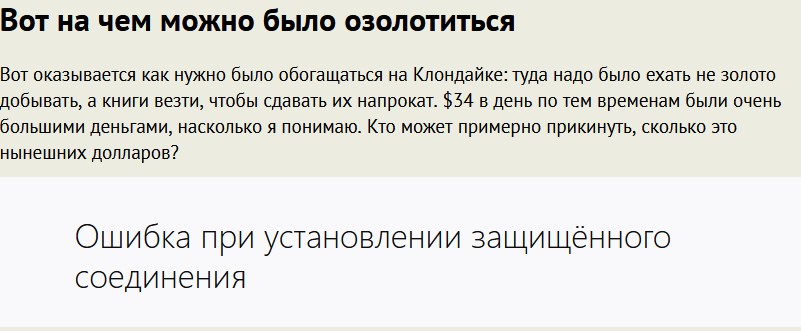 Вот оказывается как нужно было обогащаться на Клондайке: туда надо было ехать не золото добывать, а книги везти, чтобы сдавать их напрокат. $34 в день по тем временам были очень большими деньгами, насколько я понимаю. Кто может примерно прикинуть, сколько это нынешних долларов?