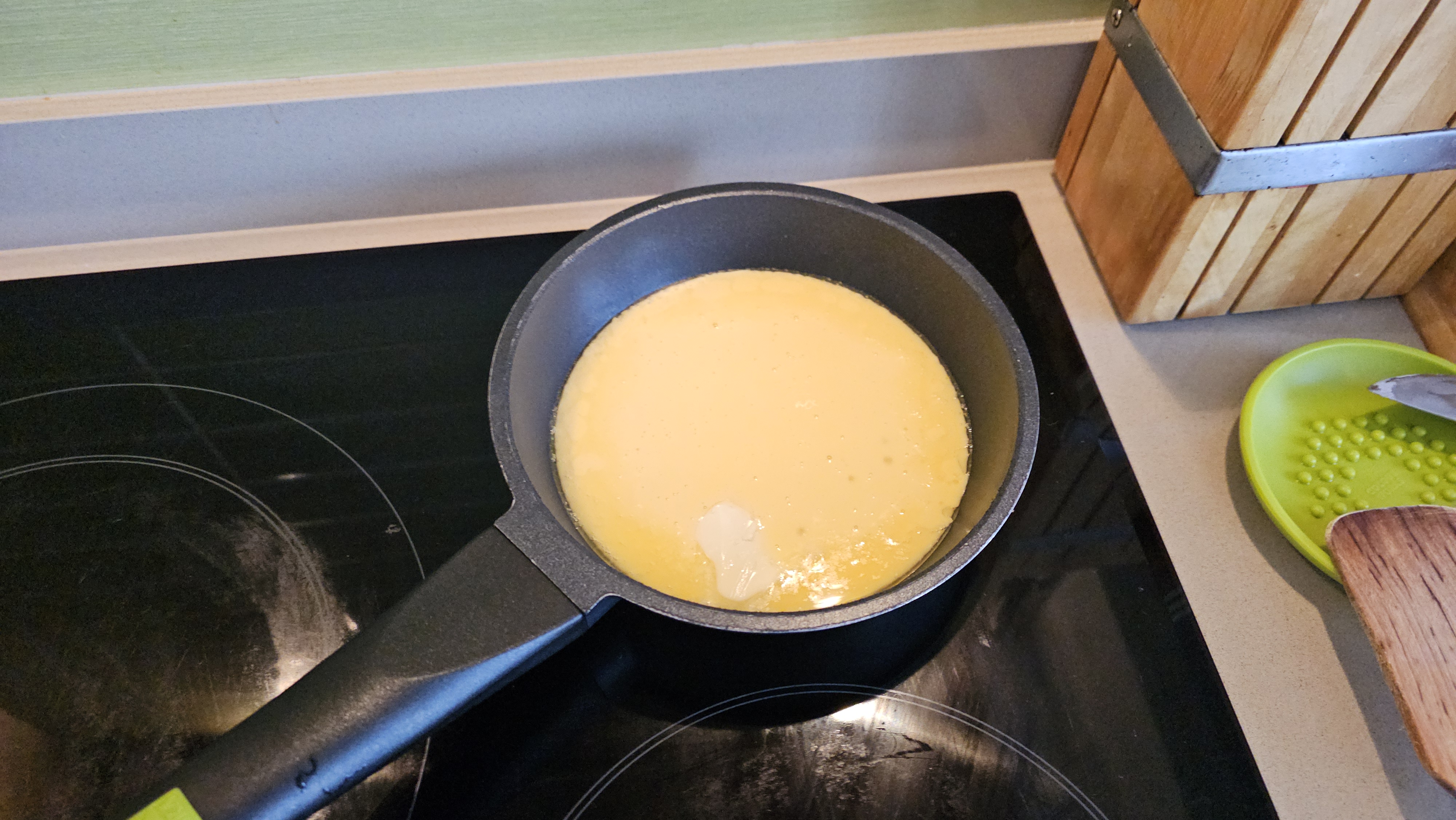 А потом выяснилось, что у меня жена умеет готовить такой воздушный омлет. И она меня научила. Никаких особых секретов там нет. Два яйца, столовая ложка сливок, взбить вилкой. Взять маленькую сковородку, на нее кусок сливочного масла (или топленого масла), растопить. На сковородку вылить смесь. Готовить на среднем нагреве (6 из 9 на нашей индукционке).