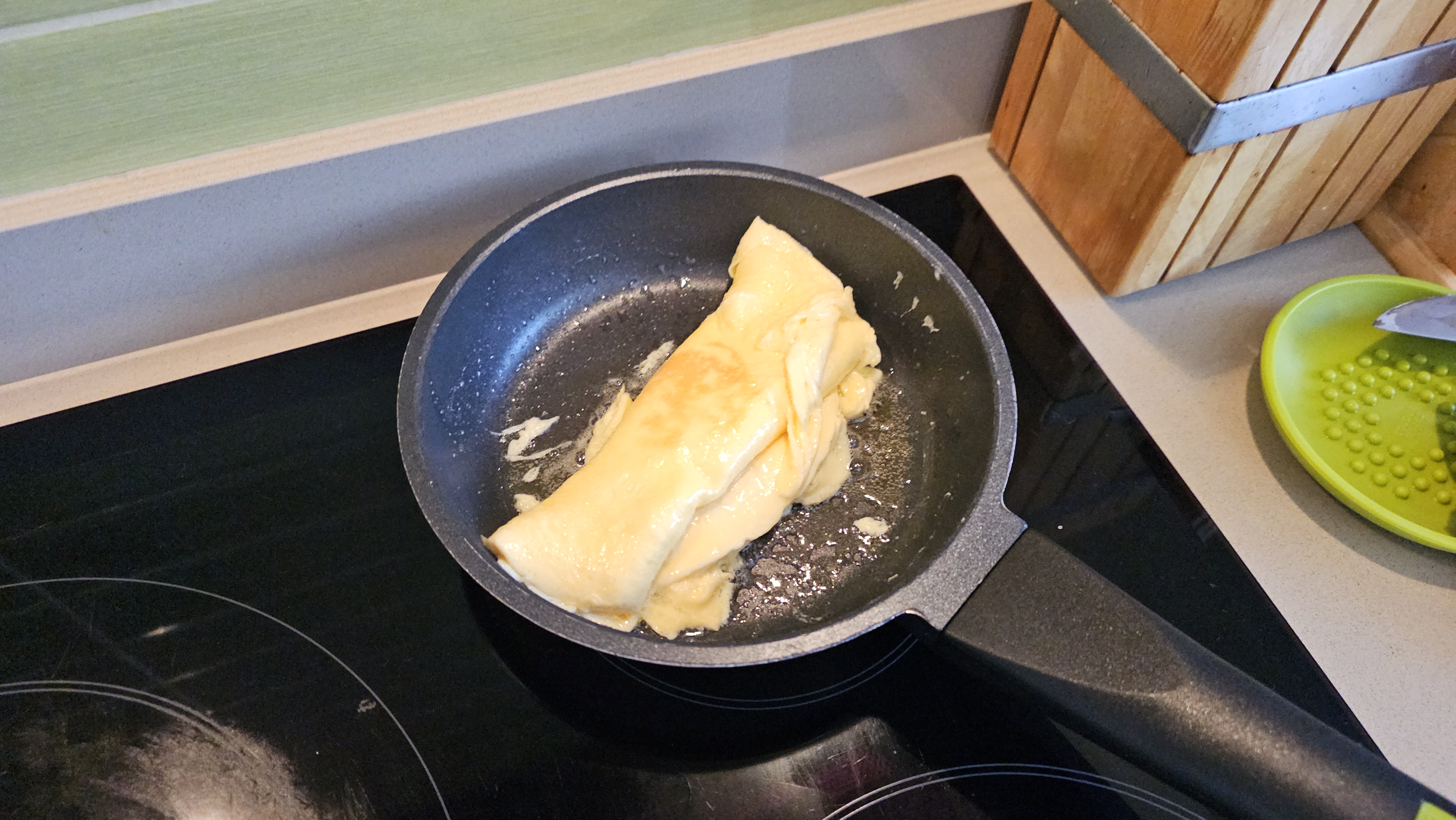Сложили - и все, выключаем нагрев, омлет перекладываем на тарелку, он сам дойдет.
