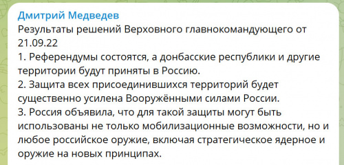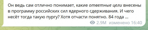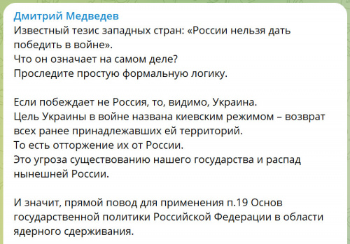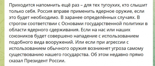 "Наши недруги, наши враги цинично спекулируют на этой ситуации, пытаясь приписать нам отсутствующие намерения применить в связи с происходящим на Украине ядерное оружие. Никаких изменений в нашем подходе к этому сложному и вызывающему тревогу у многих вопросу не произошло", - сказал Рябков в интервью журналу "Международная жизнь". (Отсюда.)