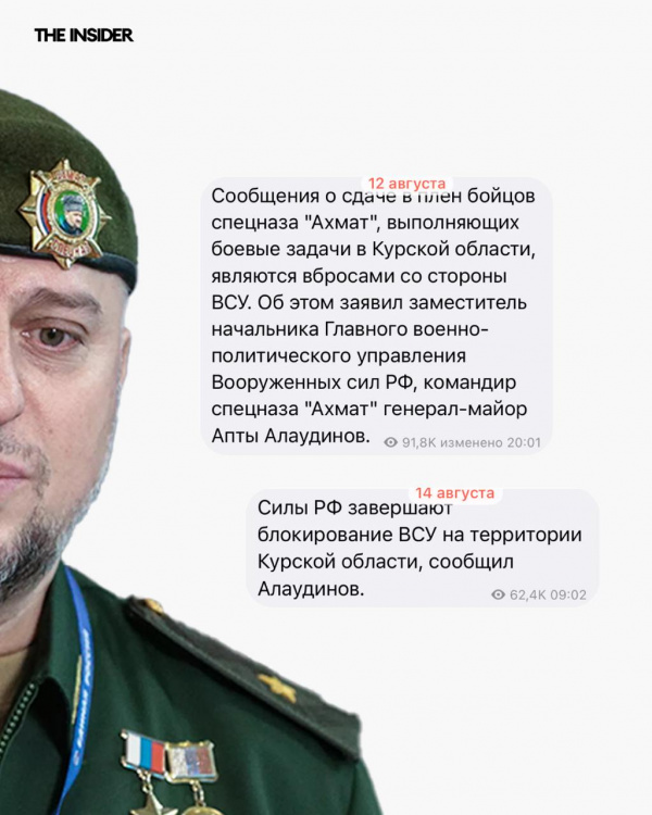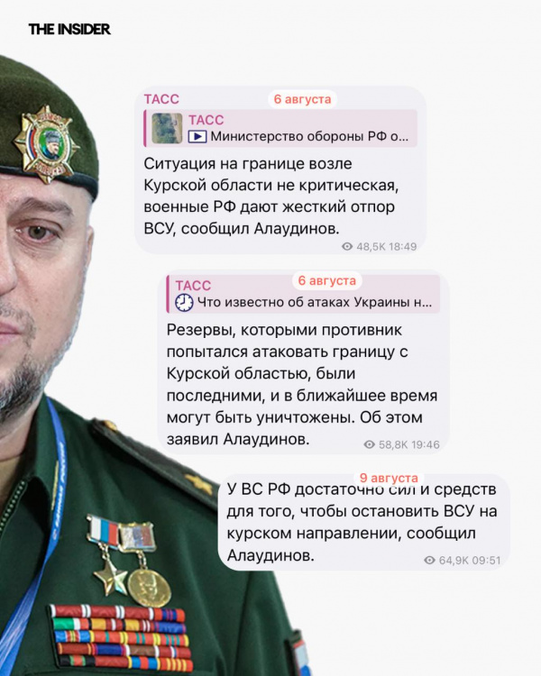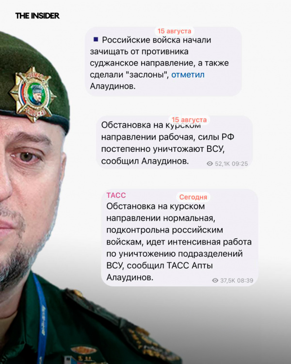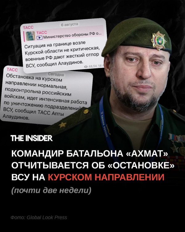 В издании The Insider аккуратно собрали по дням все заявления командира батальона «Ахмат» Апти Алаудинов с первого дня наступления ВСУ в Курской области. Его постоянно цитируют в СМИ. Прикольно было почитать.