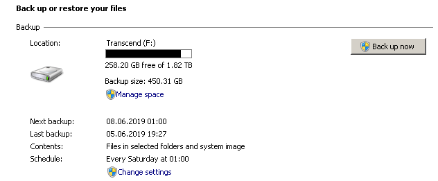 Как вариант - можно подключить диск и запускать родной виндовый бэкап с дефолтными настройками хоть каждый день.