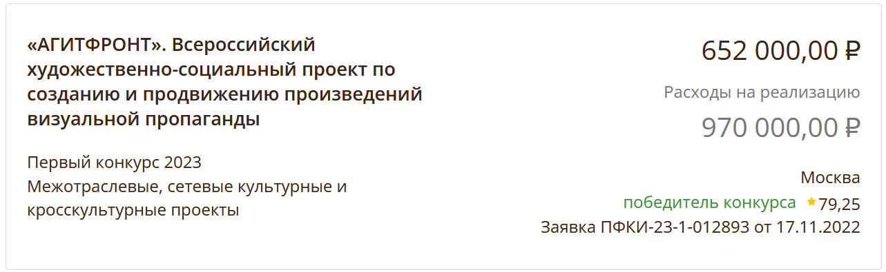 Московское отделение Союза художников России при поддержке Президентского фонда культурных инициатив и информационно-выставочного агентства "АртКонтракт" провело Всероссийский конкурс по созданию произведений визуальной пропаганды "Агитфронт". Заявки на конкурс принимались до 23 апреля сего года.