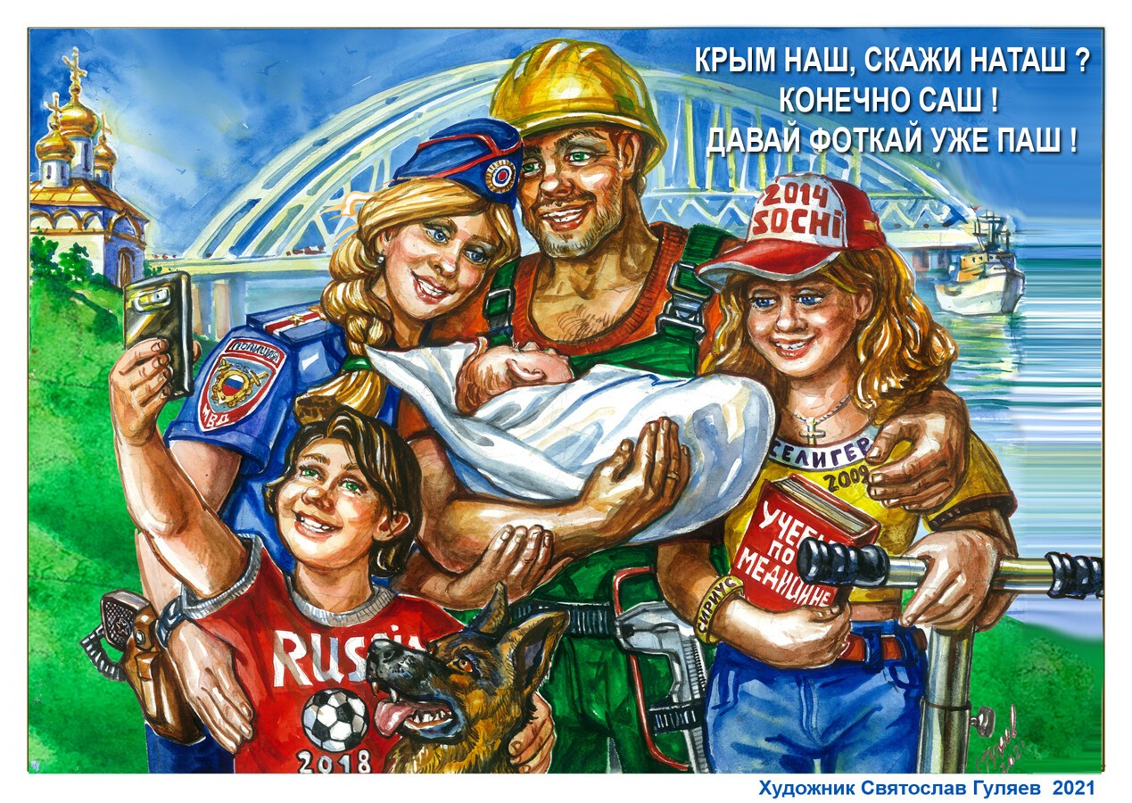 Также очень понравилась работа "Российская семья". Как пишет художник, "картина изображает Российскую семью из пяти человек и собаку", также картина радует нас прелестными виршами "Крым наш? Скажи, Наташ!" Короче говоря, кончай её, Семен!
