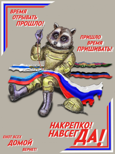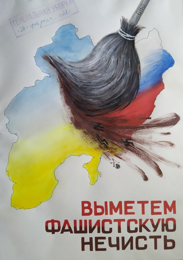 Андрей Санников порадовал плакатом "Выметем фашистскую нечисть". На плакате метла стирает какое-то дерьмо с карты Украины: дерьмо раскрашено в цвета российского флага, символизируя захваченные армией РФ территории, и нам с котом Бубликом кажется, что Андрей Санников за эту работу, конечно, огребет, но не премию, а лет семь отсидки. Но мы аплодируем художнику за смелость, да.