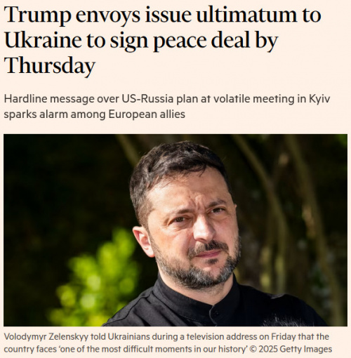 Они ошиблись. Трамп, судя по всему, окончательно слетел с катушек и в ультимативной форме требует от Зеленского подписать эту галиматью под названием "мирный план" до 27 ноября. Явно он просто уже решил съехать с темы, и этот "мирный план" - удобный повод это сделать, заявив, что гениальный Трамп потратил столько усилий для достижения мира, а этот неблагодарный Зеленский не принял Большой Прекрасный Очаровательный Мирный План Трампа, а кроме того, у него же там коррупция, чего он вообще вякает-то?