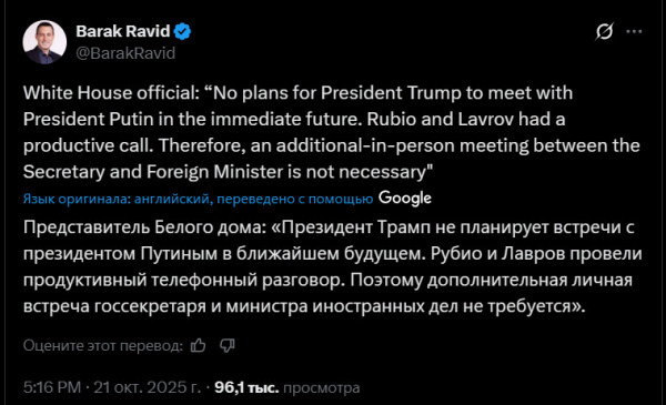 Так, говорит, хорошо поговорили Рубио с Лавровым, так душевно, что теперь-то зачем Трампу встречаться с Путиным? Чтобы послушать про печенегов и половцев? Да его как-то не прикалывает. А "Томагавки" все равно не даст, потому что он сосредоточен на дипломатии.