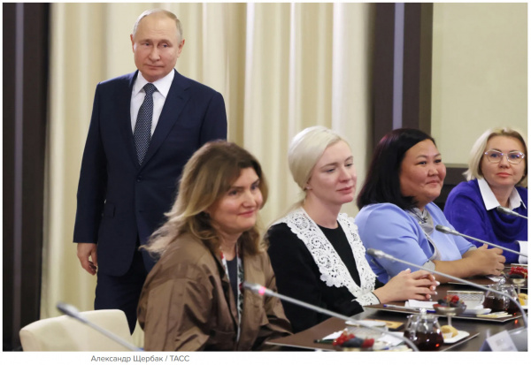 Президент РФ Владимир Путин встретился с матерями военнослужащих — участников «спецоперации» в Украине. Встречу приурочили ко Дню матери. Журналисты узнали в собеседницах Путина московскую чиновницу и депутата «Единой России», главу исполкома «Общероссийского народного фронта» из Подмосковья, члена Общественной палаты, а также режиссера православного патриотического кино. Президент рассказал, что российские военнослужащие противостоят в Украине «нацистам», обсудил аннексию украинских территорий, политику, культуру и социальные вопросы. Одна из участниц — Нина Пшеничкина из самопровозглашенной ЛНР — показала Путину фотографию своего сына, который в 2014 году ушел «воевать за русский мир» и погиб. Выяснилось, что Константин Пшеничкин погиб в 2019 году — до начала полномасштабной войны в Украине. Представительница от Чечни похвалила президента РФ и главу республики Рамзана Кадырова, а режиссер патриотического кино пожаловалась, что фестивали «Артдокфест» и «Кинотавр» «мучали» людей «нелюбовью» к России. (Отсюда.)