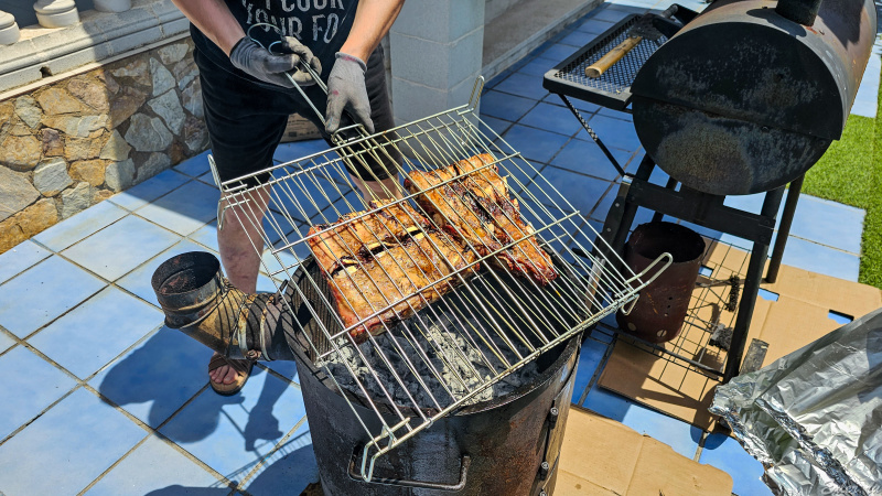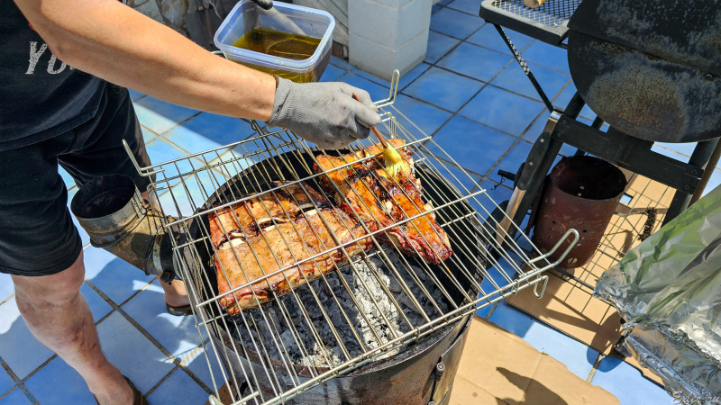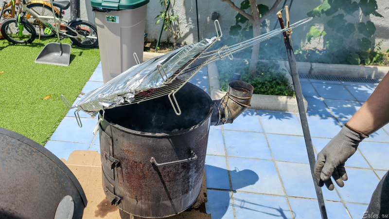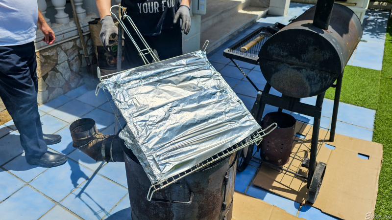 Серхио для этого использовал дровяную печку под казан, большую решетку для жарки и подпорку. Говяжьи ребра - блюдо очень непростое, его нужно готовить довольно долго при определенных условиях. Мясо сверху было накрыто фольгой.