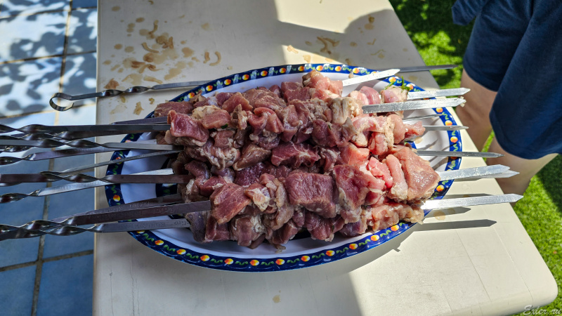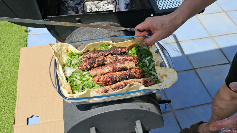 Кебаб. Совершенно новое блюдо. Серхио один раз уже пытался его делать, но не получилось: фарш разваливался при попытке сделать колбаску на шампуре. Выяснилось, что фарш просто нужно еще лучше вымесить - тогда и структура будет требуемая. В итоге с этими кебабами оказалось все в порядке - и нанизались без проблем, и оказались вкуснейшими.