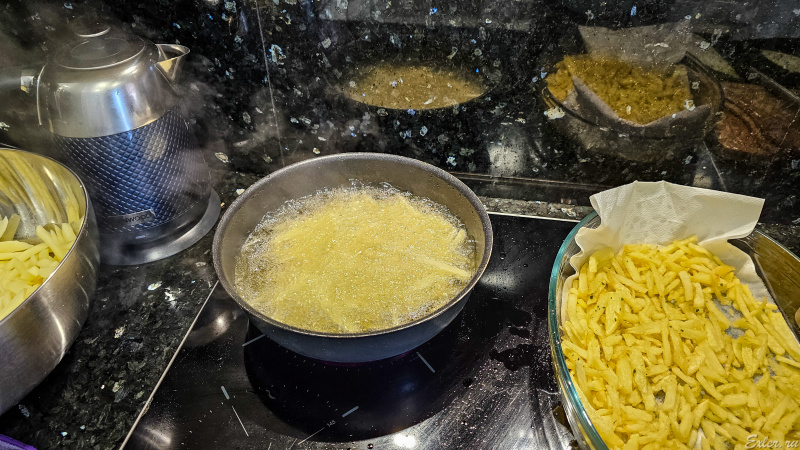 В качестве одного из гарниров сделали картошку-фри по-домашнему. Свежую картошку порезали соломкой, добавили чеснока и зелени, обжарили в масле. Получилось очень вкусно, даже я оскоромился, не удержался.