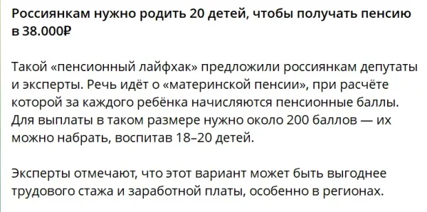 Представляю разочарование свиноматок, когда пенсию за рождение 20 будущих солдат не введут или отменят, а на нее была сделана ставка.