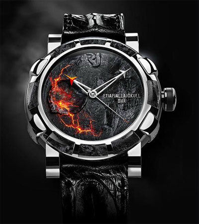 Часовщики не дремлют. Ромэйн Жером уже выпустил часы под названием Эйяфьятлаййоптыть. Они отделаны вулканическим пеплом того самого шалунишки. Самолетики на стрелках смотрятся особенно трогательно. (Спасибо Человеку-турбийону за ссылочку.)