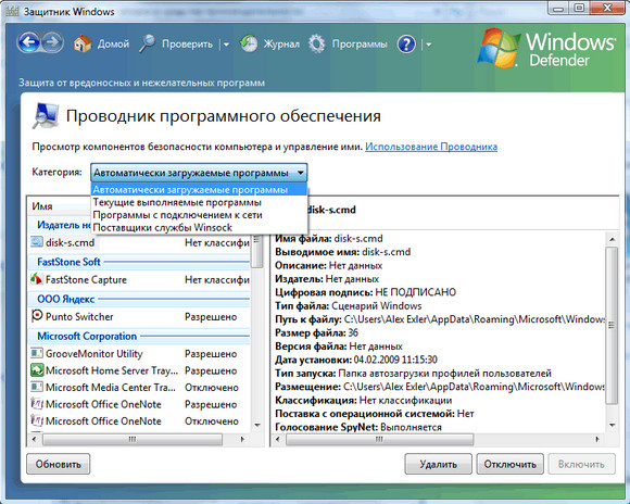 Alex Exler : Еще один момент. В Vista в Defender была очень удобная утилита просмотра и редактирования загружаемых сервисов-приложений.