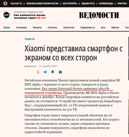 Прошло всего несколько дней с момента представления компанией Huawei смартфона Mate 30 Pro с экраном-водопадом, и компания Xiaomi сделала свой ход конем, представив смартфон Xiaomi Mi Mix Alpha, у которого экран не просто водопад, а фактически полностью опоясывает все тугое тело смартфона. Там только на задней крышке оставлена узкая полоска, в которой разместились камеры. Выглядит это все совершенно психоделично, в чем смысл подобного нововведения - непонятно совершенно, как всем этим пользоваться - еще более непонятно, но зато известно, что за этот смартфончик в Xiaomi хотят аж $3000. Ну что ж, удачи им, радости и хорошего настроения, больше на это сказать нечего.