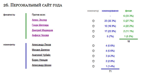mar496: А мои поздравления Анфисе Чеховой. Дважды. Во-первых (главное) - обскакала Семенович, во-вторых, пристроилась в затылок президенту.