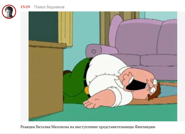 Показ миллиардера-трансвестита в программе "Время" для Милонова, видимо, нормально. Ибо молчал в тряпочку. А две тетки разок чмокнулись после одиннадцати вечера - "ужос-ужос".