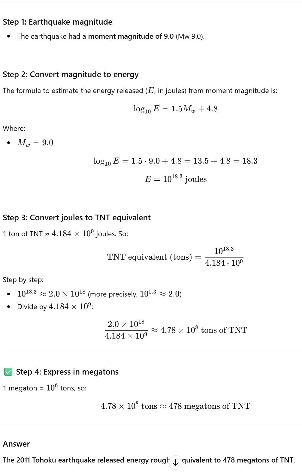 You’re asking about the **March 11, 2011 Tōhoku earthquake** in Japan, which triggered the devastating tsunami and the Fukushima Daiichi nuclear disaster. Let’s calculate its released energy in TNT equivalent carefully.