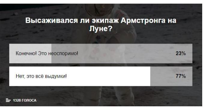 Высадка американцев на Луну поделила мир на два экспертных лагеря. Специалисты из первого лагеря утверждают, что высадка была. Специалисты из второго лагеря, наоборот, утверждают, что высадка была сфальсифицирована.