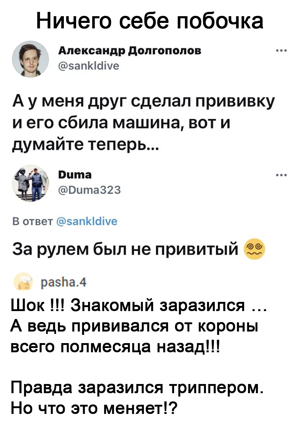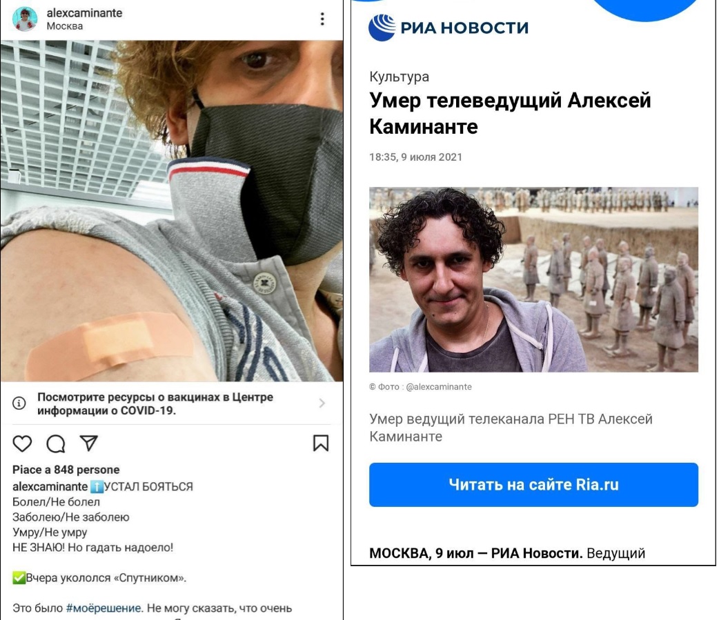 По соцсетям упоротые антиваксеры активно вбрасывают всякие фейки про несчастных россиян, которые или немедленно померли после прививки, или у них на лбу вырос хер.