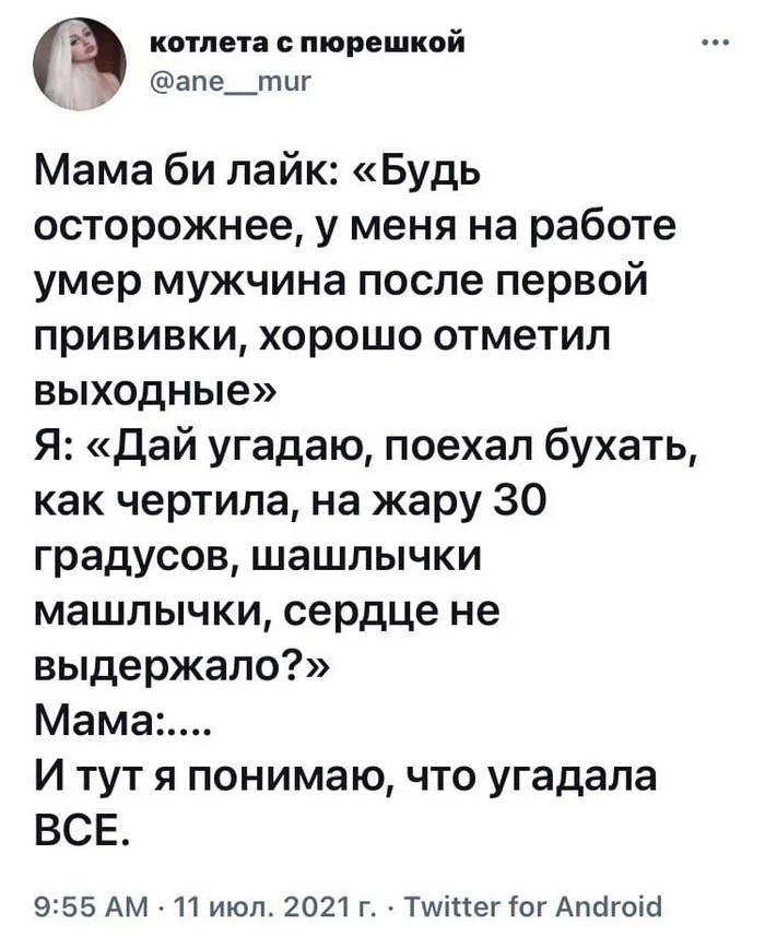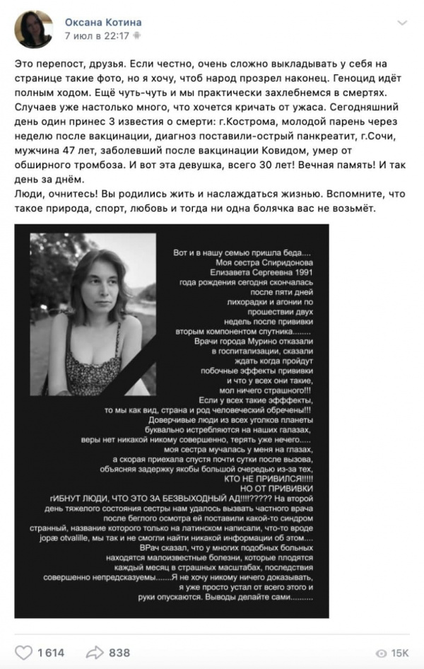 У "упоротого антиваксера" - про его шурина (см. пост от 4 июля). Никонова - 43 года, умерла неизвестно от чего. Пропагандировала прививки, в конце января привилась, в апреле развился сахарный диабет, и - внезапная смерть по неизвестной причине. Может, "так совпало", а может антипрививочники отравили тайным ядом. Что интересно, почти во всех интернет-публикациях о причинах смерти и о прививке не упоминают - просто типа внезапно умерла.