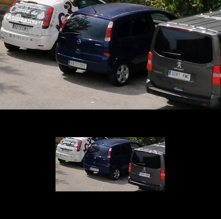 Не все так однозначно. С номерами машин, вроде бы, наглядно, хотя простая логика подсказывает, что что-то здесь не так. Матрица одна и та же, байеровский фильтр на матрице один и тот же, сигнал с матрицы снимается один и тот же, что в режиме 10 мп, что в режиме 40 мп. Преобразование в 10 мп происходит на уровне софта. Не думает же кто-то, что 4 пикселя матрицы физически превращаются в один с одним цветным фильтром перед ним и именно с одного этого элемента снимается сигнал? Нет, снимается 4 сигнала с 4 соседних элементов матрицы. А далее может различаться алгоритм дебайеризации. Но это не должно приводить к существенной разнице между при сравнении результатов внутрикамерного и внешнесофтового ресайза.