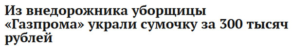 Ну, впрочем, когда у нас в Москве у безработных крадут "Бентли", "Ламборгини" или чемоданчик с парой миллионов долларов, то почему бы и уборщице "Газпрома" не иметь внедорожник и сумочку в тринадцать среднемесячных зарплат по стране?