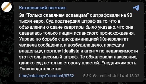 славянамиспанцам” оштрафовали на 90 тысяч евро. Суд подтвердил штраф за то, что в объявлении о сдаче квартиры было указано, что она сдавалась только лицам испанского происхождения. Управа по борьбе с дискриминацией Женералитат увидела сообщение, и возбудила дело, присудив владельцу, порталу Idealista и агенту по недвижимости этот такой весомый штраф. Те обжаловали наказание, однако суд встал на сторону властей. (Отсюда.)