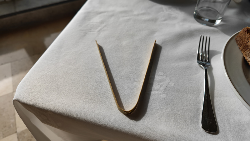 В данном отеле, к счастью, все было по крайней мере терпимо. Стойка с закусками разнообразием не блистала никак, но были ветчина-хамон-колбаски, сыр, семга, молоко-йогурты и хлеб. И это все можно было брать самому: на столе у каждой тарелки лежали вот такие индивидуальные щипчики, которыми полагалось брать что-то с общих подносов.