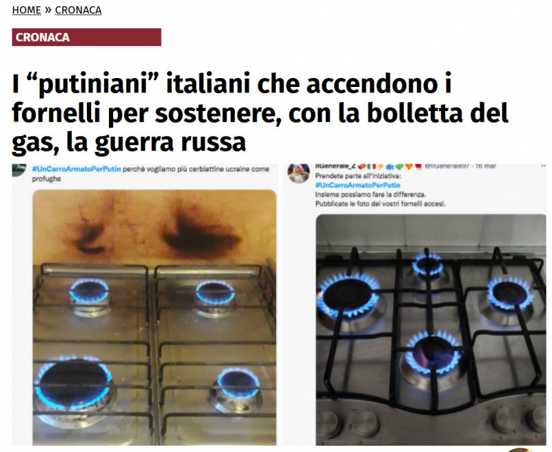 Там говорится о том, что упоротые путиноиды (а такие в Италии, безусловно, есть, как и в других странах) запустили в Твиттере хэштэг #Uncarroarmatoperputin - они призывают включить плиту на максимум, чтобы потреблять как можно больше газа. Таким образом, по "стратегии" этих упоротых, они поддержат российскую армию.