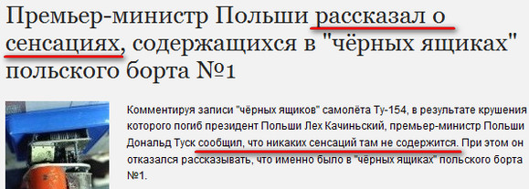 Так придраться-то не к чему. Туск сказал, что сенсаций там не содержится, верно ж? Следовательно, он говорил о сенсациях, там содержащихся. Пустое множество - прежде всего множество. Так что название содержимому не противоречит... А то, что любой адекватный человек назвал бы статью иначе - это уже второй вопрос, "продвинутым" журналистам некогда о такой мелочи задумываться.